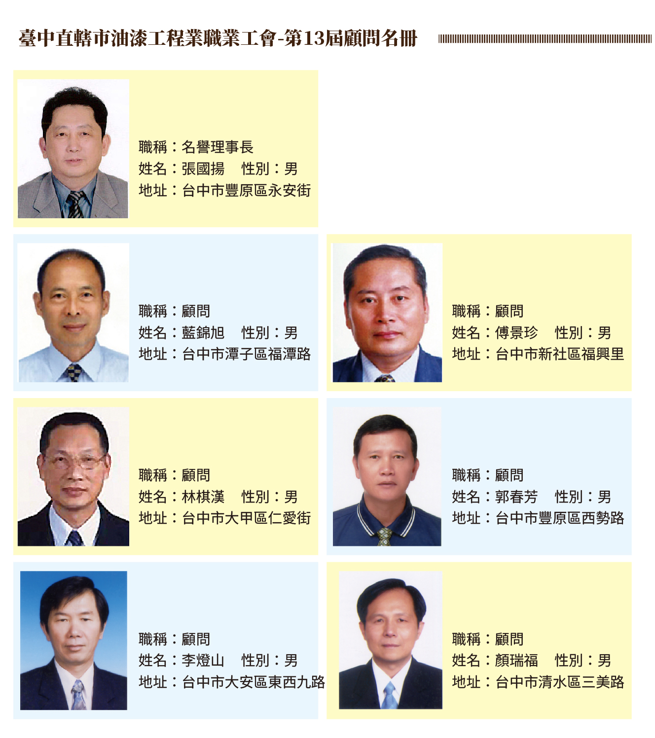 臺中直轄市油漆工程業職業工會-第13屆顧問名冊